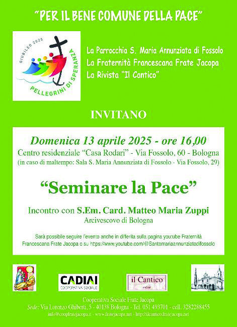 Seminare la pace Il Card. Zuppi la domenica delle Palme ha partecipato a BO all'incontro promosso a Casa Rodari dalla FFFJ e dalla parrocchia S. Maria di Fossolo Leggi tutto...