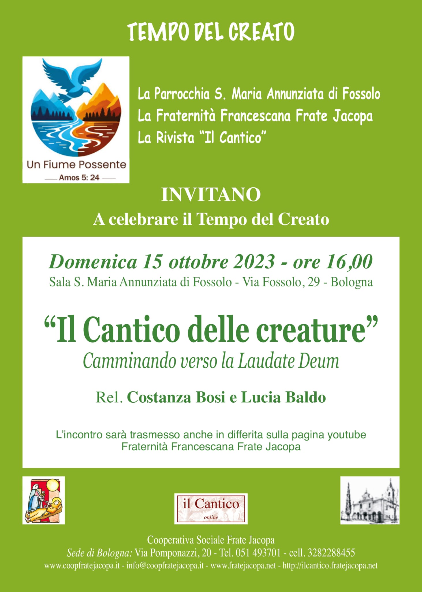 L’incontro si tiene come solito a Bologna presso la Parrocchia S. Maria Annunziata di Fossolo che sempre condivide con noi questi percorsi. Non sarà possibile la diretta streaming, ma desideriamo farne anche un particolare momento di comunione con tutte le Fraternità Frate Jacopa che potranno connettersi con il link sottoindicato a loro dedicato.